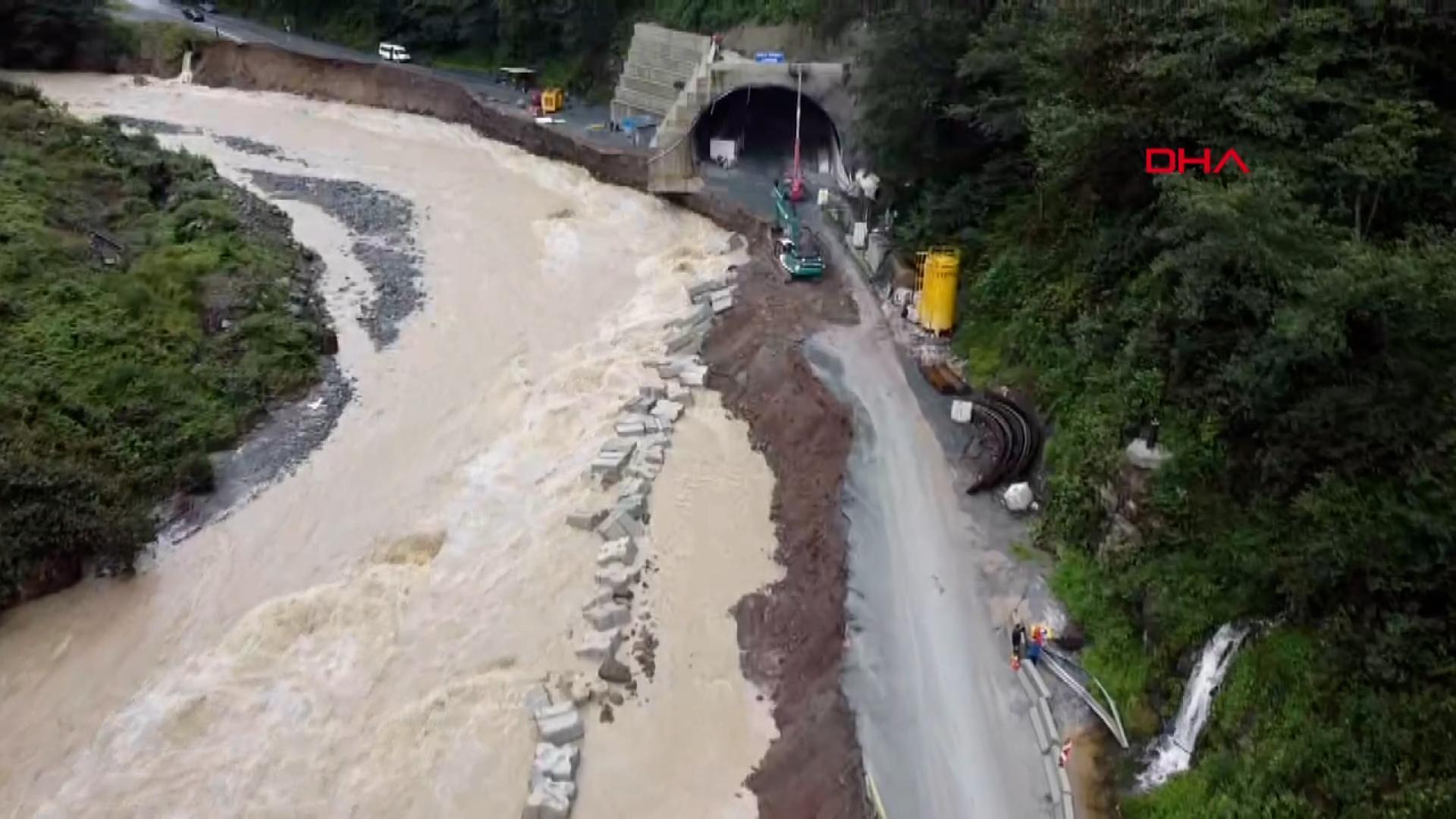 Rize’de şiddetli sağanakla oluşan selin ardından çökme sonucu ünlü turizm merkezi Ayder Yaylası yolu ulaşıma kapanınca, bölgedeki otellerde konaklayan turistler, dönüşe geçemedi. Çökme yaşanan yolda geniş güvenlik önlemleri alındı. Ayder Yaylası’na ulaşım sağlanan tek yolda, Rize Şehir Hastanesi’nin deniz dolgusunda kullanılan ‘C ve antifer’ adlı bloklar, kara yolunda dolgu malzemesi görevi görmesi için dereye yerleştiriliyor. Yolun yeniden onarılması için ekipler iş makineleriyle yağmura rağmen aralıksız çalışarak, yolu yeniden ulaşıma açmayı hedefliyor. Çalışmaların akşam saatlerinde sonuç vermesi amaçlanırken, yeniden bölgeye gelen Ulaştırma ve Altyapı Bakanı Abdulkadir Uraloğlu ile Gençlik ve Spor Bakanı Osman Aşkın Bak, onarım çalışmaları süren yolda incelemelerde bulundu. Ekiplerin, çalışmaları da dron ile görüntülendi.