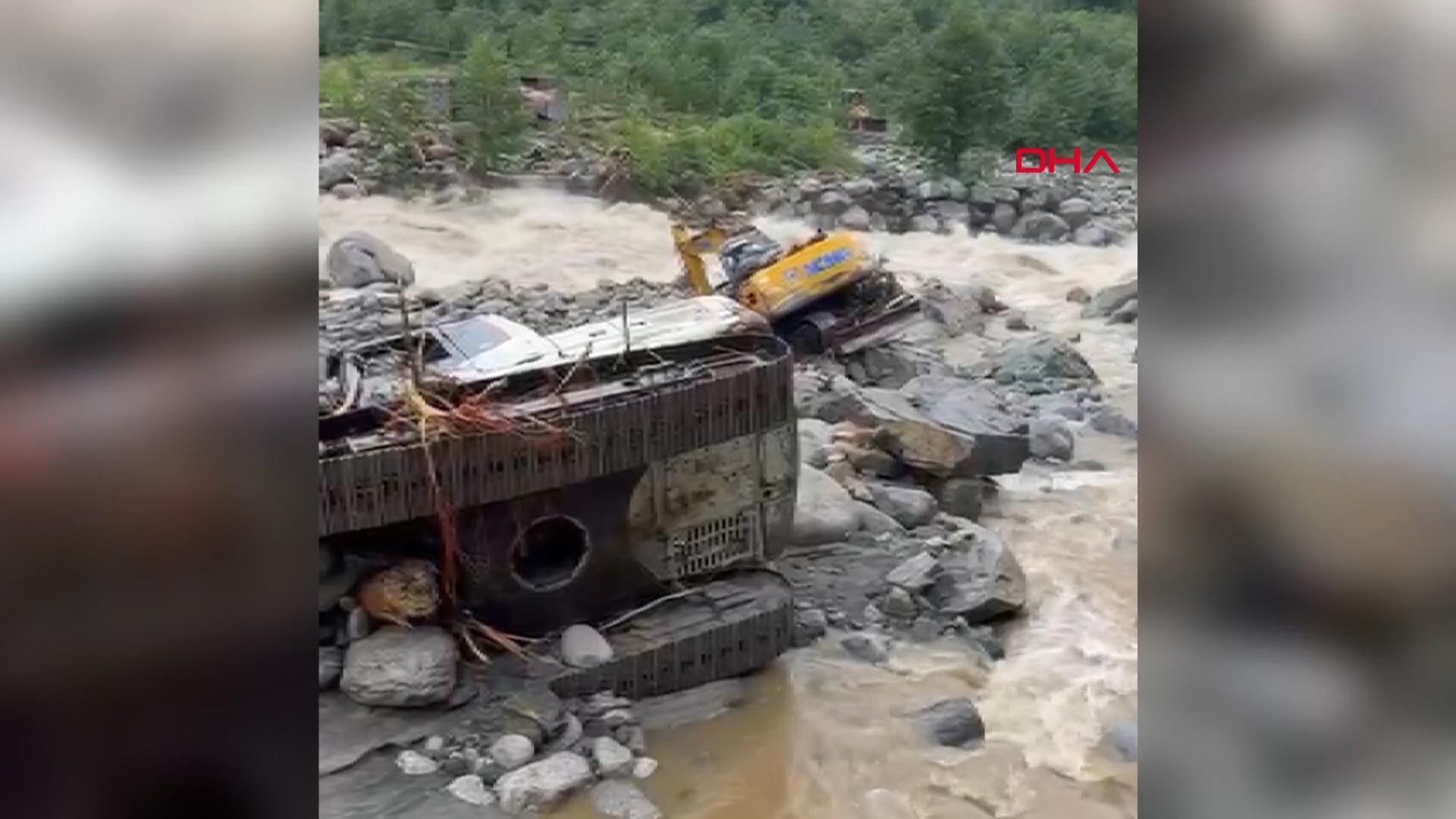 Rize'de iş makineleri devrildi, bungalovları sel vurdu