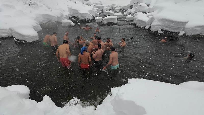 Suya girince vücudun alıştığını ifade eden Ömer Yılmaz, "Su gayet sıcak. Ben her sene deneyimliyorum. Kar yağışıyla beraber daha güzel oldu. Suya girdikten sonra vücut daha dinç oluyor” ifadelerini kullandı.