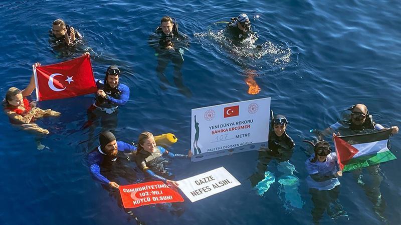 Suya kurulan asansör sistemi sayesinde saniyede 2 metre hızla 107 metre derinliğe ulaşan milli sporcu, daha sonra sistemden ayrılarak kol gücüyle su yüzeyine doğru çıkmaya başladı. Güvenlik dalgıçlarının eşlik ettiği Şahika Ercümen başarılı şekilde dalışını tamamlayıp, yüzeye çıktı. Herhangi bir problem yaşamayan Şahika Ercümen'in rekoru hakemlerin incelemesinin ardından onaylandı. Rekorunu suda kutlayan Şahika Ercümen ve ekibi, Türk ve Filistin bayrakları açtı. Milli sporcu 'Cumhuriyetimizin 102. yılı kutlu olsun' ve 'Gazze nefes alsın' yazılı dövizlerle poz verdi.
