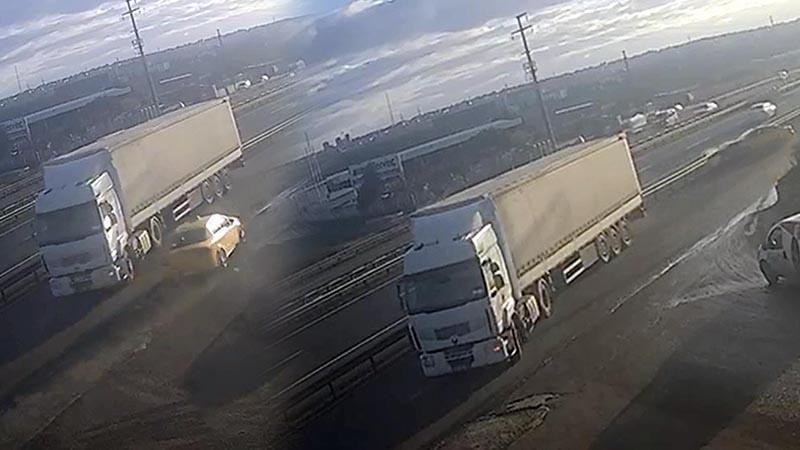 Åžerit deÄŸiÅŸtiren TIR’a çarpmamak manevra yapan taksi bariyere çarptı