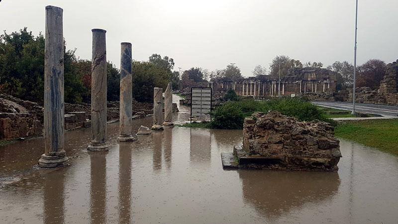 Diğer yandan şiddetli yağış nedeniyle Side Antik Kenti'de Sütunlu Cadde ve Tyke Tapınağı'nın bulunduğu alan su altında kaldı. Dün yapılan şiddetli yağış ve fırtına uyarısının ardından Side Limanı'nda bulunan tekne ve motorlar sahipleri tarafından güvenli yerlere çekildi. Yağış nedeniyle Apollon Tapınağı da boş kaldı.