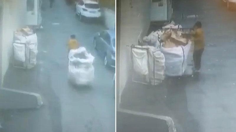 Atık toplayıcısının bir günlük emeÄŸi olan kağıt dolu çuvalı alıp, boÅŸ çuvalın bırakılması güvenlik kamerası tarafından kaydedildi. Görüntülerde, çek çek arabası ile sokaÄŸa giren atık toplayıcısı, kağıt dolu çuvalı fark etti. Bir süre etrafa baktıktan sonra kendi boÅŸ çuvalını bırakıp, kağıt dolu çuvalı çek çek arabasına koyarak uzaklaÅŸtı.