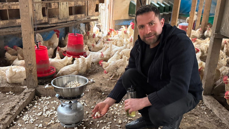 Ağzı açık tencereden etrafa sıçrayan patlamış mısırları yiyen tavukların zamanla streslerinin azaldığını gözlemleyen Tanrıvermiş, "Kış aylarında özellikle yağışlı havalarda tavuklarımı doğaya salamadığım için kümeste strese girmeye başladılar. Yumurta sayılarında da biraz düşüş olduğunu belirledim. 'Tavuklarımın stresini nasıl azaltabilirim' diye düşünürken sanal medyada patlamış mısır yiyen tavuk videoları gördüm ve ben de denemek istedim. Tavuklarım için kümeste mısır patlatmaya başladım. Onlar için de güzel ve değişik bir etkinlik oldu. Böylece hem hareket etmiş oluyorlar hem de patlamış mısır yiyerek damak tatları değişmiş oluyor. Ayrıca yumurta sayılarında bir artış olduğunu da fark ettim" dedi.