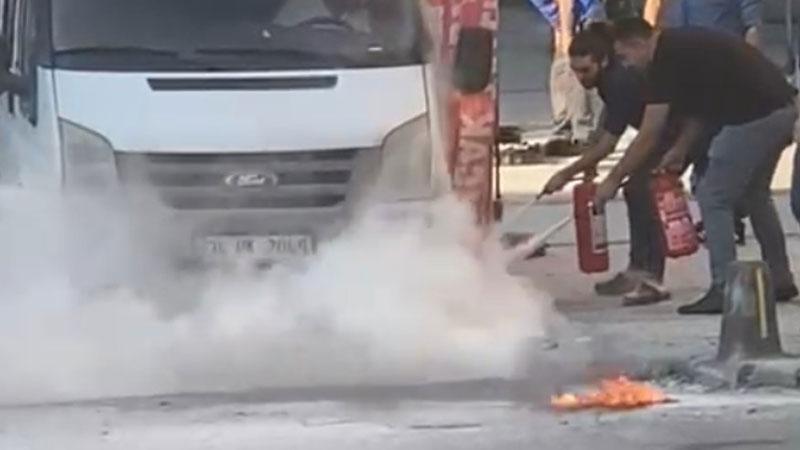 Yangına müdahale eden esnaflardan Muhammed Mamuk, “Birden yerden alevler yükselmeye başladı. Alevler park halindeki minibüse sıçradı. Biz de hemen yangın söndürme tüplerini alarak, yangına müdahale ettik ve söndürdük. Araç sahibi de gelerek hemen aracını bölgeden uzaklaştırdı. Sonra yangın yerine kum ve toprak döktük. Eğer müdahale etmemiş olsaydık araç tamamen yanabilirdi. Zaten tamponu yandı" dedi.