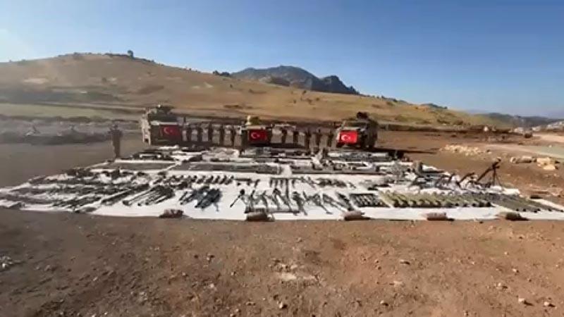 "53 adet AK-47 ve M16A4 piyade tüfeği, 1 adet geri tepmesiz top, 5 adet Doçka uçaksavar, 9 adet keskin nişancı tüfeği ve 29 adet bastırıcı, 1 adet M79 tanksavar silahı ve 6 adet mühimmatı, 1 adet LAW, 7 adet tel güdümlü Konkurs tanksavar silahı, 5 adet AT-4 tanksavar silahı, 6 adet SA-7 hava savunma füzesi, 1 adet 82 mm havan ve 14 adet mühimmatı, 3 adet 60 mm havan ve 9 adet mühimmatı, 2 adet 107 mm katyuşa silahı ve 7 adet mühimmatı, 3 adet 40 mm 6’lı bombaatar ve 66 adet mühimmatı, 2 adet tekli bombaatar, 1 adet M1 keskin nişancı tüfeği, 6 adet Dragunov keskin nişancı tüfeği ve 46 adet şarjör, 2 adet av tüfeği ve 31 adet mühimmatı, 1 adet uzi makinalı tabanca, 10 adet RPG-7 roketatar, 5 adet 7.62 mm PKMS makinalı tüfek ve 4 adet yedek namlusu, 302 adet şarjör, 54 adet antipersonel ve 67 adet antitank roket mühimmatı, 127 adet sevk fişeği, 10 bin 500 adet Doçka uçaksavar ve hafif silah mühimmatı, 26 adet taarruz tipi ve 29 adet savunma tipi el bombası, 43 adet sis el bombası, 77 adet antipersonel mayını, 100 kilo el yapımı patlayıcı, pil blokları ve güç üniteleri, 2 adet teleskop, 17 adet silah üstü optik nişangah, 8 adet silah üstü termal ve 3 adet silah üstü gece görüş dürbünü, 5 adet lazer mesafe ölçer, 1 adet GPS, 6 adet araç telsizi ve antenleri, 33 adet el telsizi, 6 adet ses kayıt cihazı, 1 adet DJI mavic 3T dron, 2 adet kullanılamaz durumda DJI Phantom 4 dron, 3 takım maket uçak kanadı, 3 adet fotoğraf makinası, 1 adet kamera ve 9 adet tripod, 7 adet fastlink, 1 adet projeksiyon cihazı, 10 adet modem, 6 adet farklı cins ve ebatta medya anteni, 2 adet termal PTZ kamera, 3 adet Dome PTZ kamera, 4 Adet IP kamera, 11 adet farklı cinslerde çubuk kamera, 4 adet dikiz aynası özelliği olan izleme ünitesi, 4 adet kamera sistemlerinde kullanılan kayıt cihazı, 5 adet mikrofon sistemi, 3 adet mikrofon, 2 adet kulaklık, 3 adet hoparlör, 5 adet elektrik üretme maksadıyla kullanılan el dinamosu, 14 adet telefon ve 4 adet santral, 4 adet yazıcı, 5 adet güç kaynağı, 4 adet monitör, 3 adet klavye, 39 adet termal şemsiye, 11 adet kar şemsiyesi ve muhtelif yaşam malzemesi."
