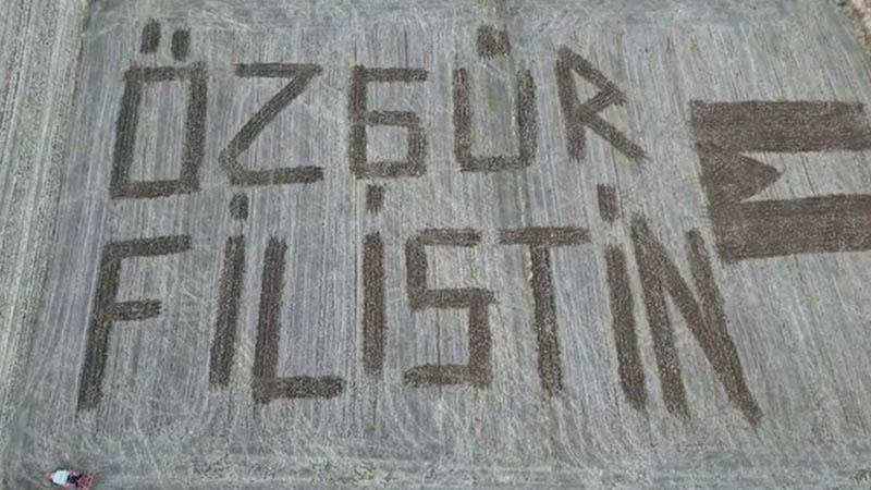Çanakkale'nin Biga ilçesinde çiftçilik yapan Hüseyin Savaş ve Fikret Savaş kardeşler, tarlalarına traktörle 'Özgür Filistin' yazdı.