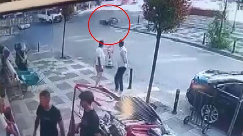 Öte yandan, kaza anı ise bir iş yerinin güvenlik kamerasına yansıdı. Görüntülerde, motosiklet sürücüsü sola dönüş yapan kamyonetin arkasından gelirken kontrolünü kaybedip metrelerce sürükleniyor. Motosiklet kaldırımdaki yayaya çarptıktan sonra duruyor. Yaya ayağa kalkarken, çevredeki esnafın panik halinde sürücünün yardımına koştuğu görülüyor.