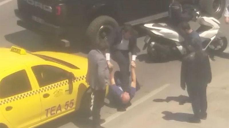 Üsküdar'da taksici ile bir sürücü arasında trafikte yaşanan tartışma kavgaya dönüştü. Sürücünün yere yatırdığı taksiciyi darbettiği anlar kameraya yansıdı.