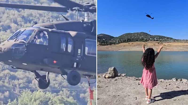 00:26Kaza sırasında savrulan motosiklet sürücüsü yayaya çarptı; o anlar kameradaTürkiye sınırındaki Suriye'nin Lazkiye kırsalının Türkmendağı bölgesinde 3 Temmuz’da başlayan orman yangını dün Yayladağı ilçesine ulaştı. Hatay Valiliği koordinesinde; Orman Bölge Müdürlüğü, belediye ve AFAD ekiplerinin müdahalesine, askeri helikopterler de destek verdi. Yangının kontrol altına alındığı sıralarda ailesiyle baraj gölünde vakit geçiren bir kız çocuğu, gölden su alan askeri helikopteri sevinçle selamladı. Pilot da çocuğa karşılık vererek el salladı. Bu anlar, çocuğun babası tarafından cep telefonuyla görüntülendi. Baba, "Kızım o da sana el sallıyor. Öpücük at" diyerek kızının sevincini paylaştı.