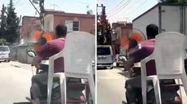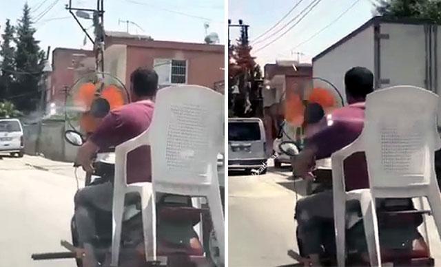 Adana'da, hissedilen hava sıcaklığının 47- 48 dereceyi bulmasıyla bunalan sürücü, motosikletinin ön kısmına pervane takarak serinlemeye çalıştı.