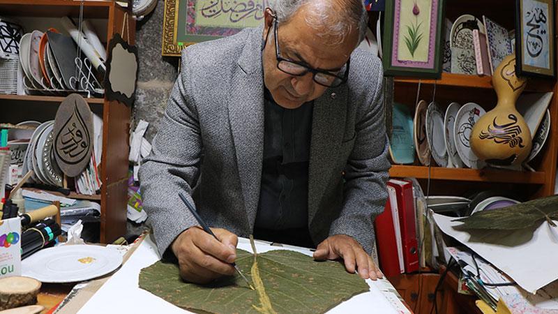 Kentte yaşayan 3 çocuk babası emekli öğretmen Osman Durmuş, ilkokul yıllarında güzel yazıya olan ilgisiyle, kaligrafi sanatına merak saldı. Üniversite yıllarına gelen Durmuş, kaligrafi sanatını nesnelere işlemeye başladı. Osman Durmuş, bir süre sonra küçük yaprakların üzerinde denediği kaligrafiyi, 25 yıldır yurt dışından getirttiği büyük yaprakların üzerine işlemeye devam ediyor. Durmuş, “Kaligrafi sanatına küçük yaşlardan itibaren güzel yazıya olan ilgiden dolayı, ilgim arttı. Bu tür yazıları görünce oradan deneyerek başladım. Ama bu başlangıç ilkokulda olmadı. Orada sevmekle oldu. Daha sonra bu tür kaligrafik yazıları lise yıllarında hatta üniversite yıllarında biraz daha geliştirdim. Taklit ederek oradan başladık ve buralara kadar geldik. Yaklaşık 25 yıl, aslında daha fazla da ben mütevazi konuşuyorum. 25 yılı aştı diyebilirim” diye konuştu.
