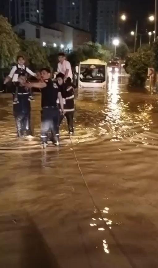 Midibüste mahsur kalan çocukları itfaiyeciler omuzlarında taşıdı
