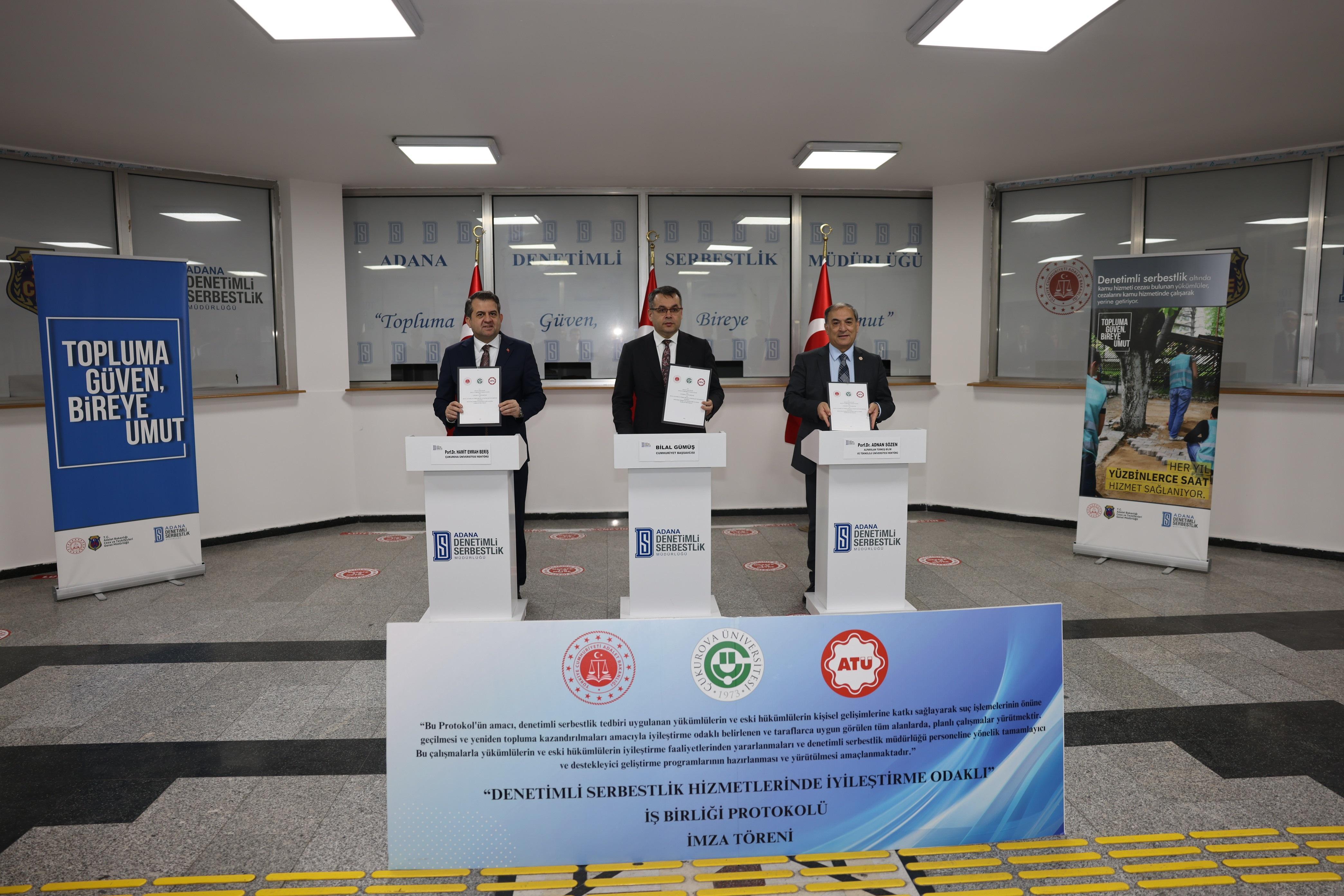 İş birliği protokolü, Adana Cumhuriyet Başsavcısı Bilal Gümüş, Çukurova Üniversitesi Rektörü Prof. Dr. Hamit Emrah Beriş ve Adana Alparslan Türkeş Bilim ve Teknoloji Üniversitesi Rektörü Prof. Dr. Adnan Sözen arasında, Adana Denetimli Serbestlik Müdürlüğü’nde düzenlenen törenle imzalandı.