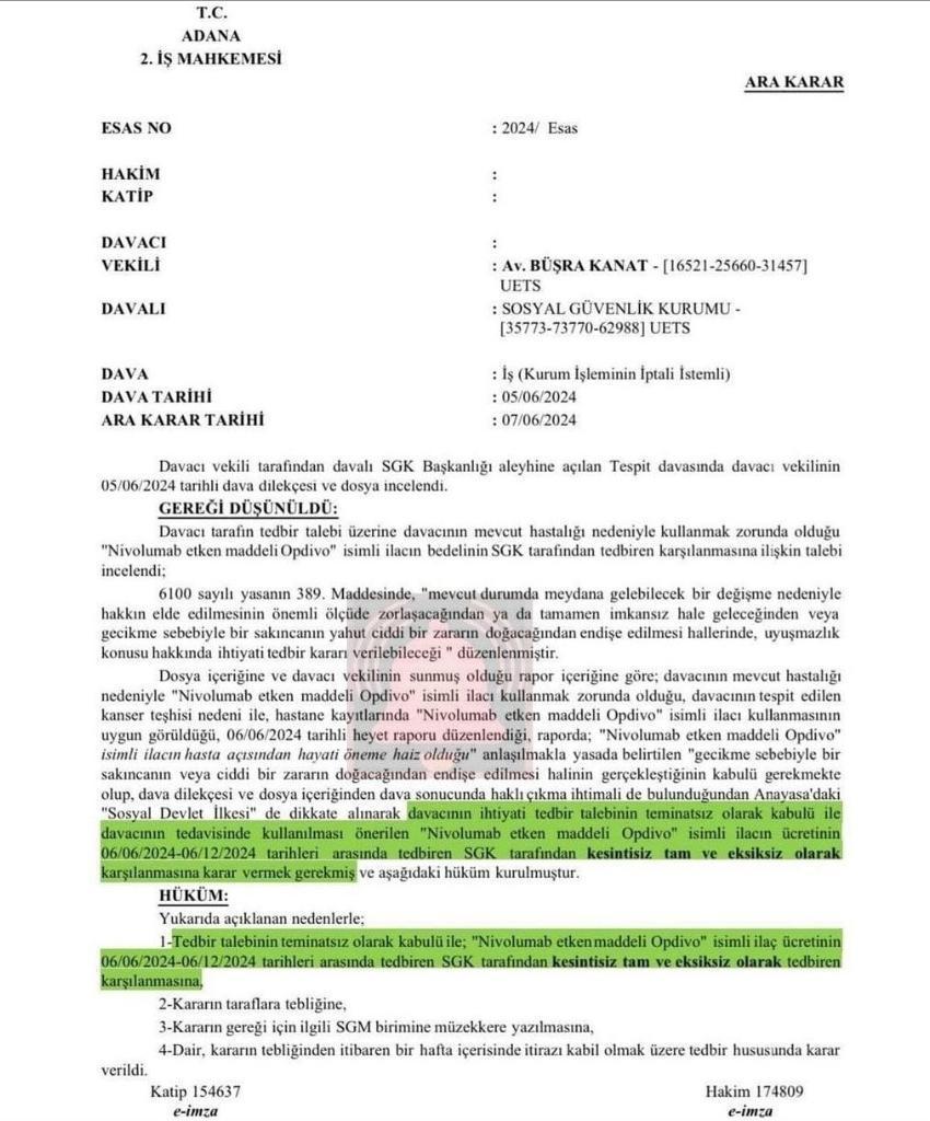 Adana’da yaşayan ve 5 yıldır böbrek kanseri ile mücadele eden erkek hasta A.U., tedavisi için ayda 3 doz kullanması gereken Opdivo isimli kanser ilacını alacak maddi gücü olmayınca avukatı Büşra Kanat aracılığıyla ilacın SGK tarafından ücretsiz karşılanması için 5 Haziran 2024’te ‘kurum işleminin iptali istemli’ dava açtı. Mahkeme hakimi ara kararında, ilacın SGK tarafından kesintisiz ve eksiksiz olarak tedbiren karşılanmasına karar verdi. Kararda, davacı tarafın tedbir talebi üzerine, davacının mevcut hastalığı nedeniyle kullanmak zorunda olduğu ‘nivolumab etken maddeli Opdivo’ isimli ilacın bedelinin SGK tarafından tedbiren karşılanmasına ilişkin talepte bulunulduğu belirtildi. Kararda, 6100 sayılı yasanın 389’uncu maddesinde ‘mevcut durumda meydana gelebilecek bir değişme nedeniyle hakkın elde edilmesinin önemli ölçüde zorlaşacağından ya da tamamen imkansız hale geleceğinden veya gecikme sebebiyle bir sakıncanın yahut ciddi bir zararın doğacağından endişe edilmesi hallerinde, uyuşmazlık konusu hakkında ihtiyatı tedbir kararı verilebileceğinin’ düzenlendiğine dikkat çekilerek, şöyle denildi: