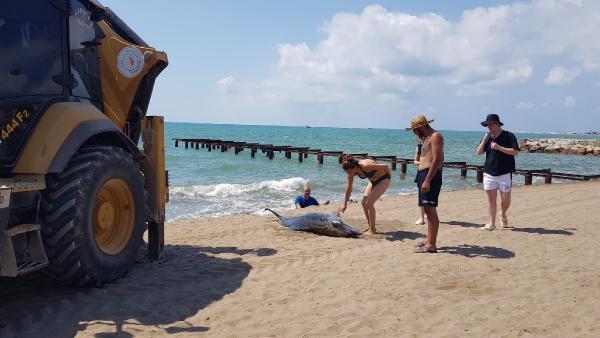 Malik GÖDELİNER/ KARATAŞ (Adana),(DHA)- ADANA'nın Karataş ilçesinde kıyıya ölü yunus vurdu. Belediye ekipleri yunusu iş makinesi ile bölgeden aldı.