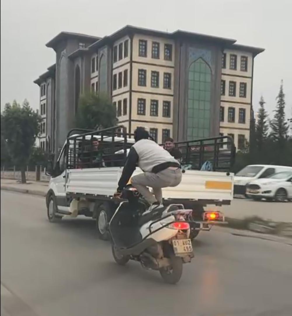 Seyhan ilçesi Turhan Cemal Beriker Bulvarı’nda ilerleyen 01 AUZ 495 plakalı motosikletin sürücüsü, tehlikeli hareketler yaptı. Önce motosikletin üzerinde ayağa kalkan sürücü, ardından da aracın üzerine uzanarak yolculuk etti. Tehlikeli yolculuk başka bir sürücü tarafından cep telefonuyla görüntülendi. Polis, sürücünün kimliğinin belirlenmesi için çalışma başlattı. (DHA)