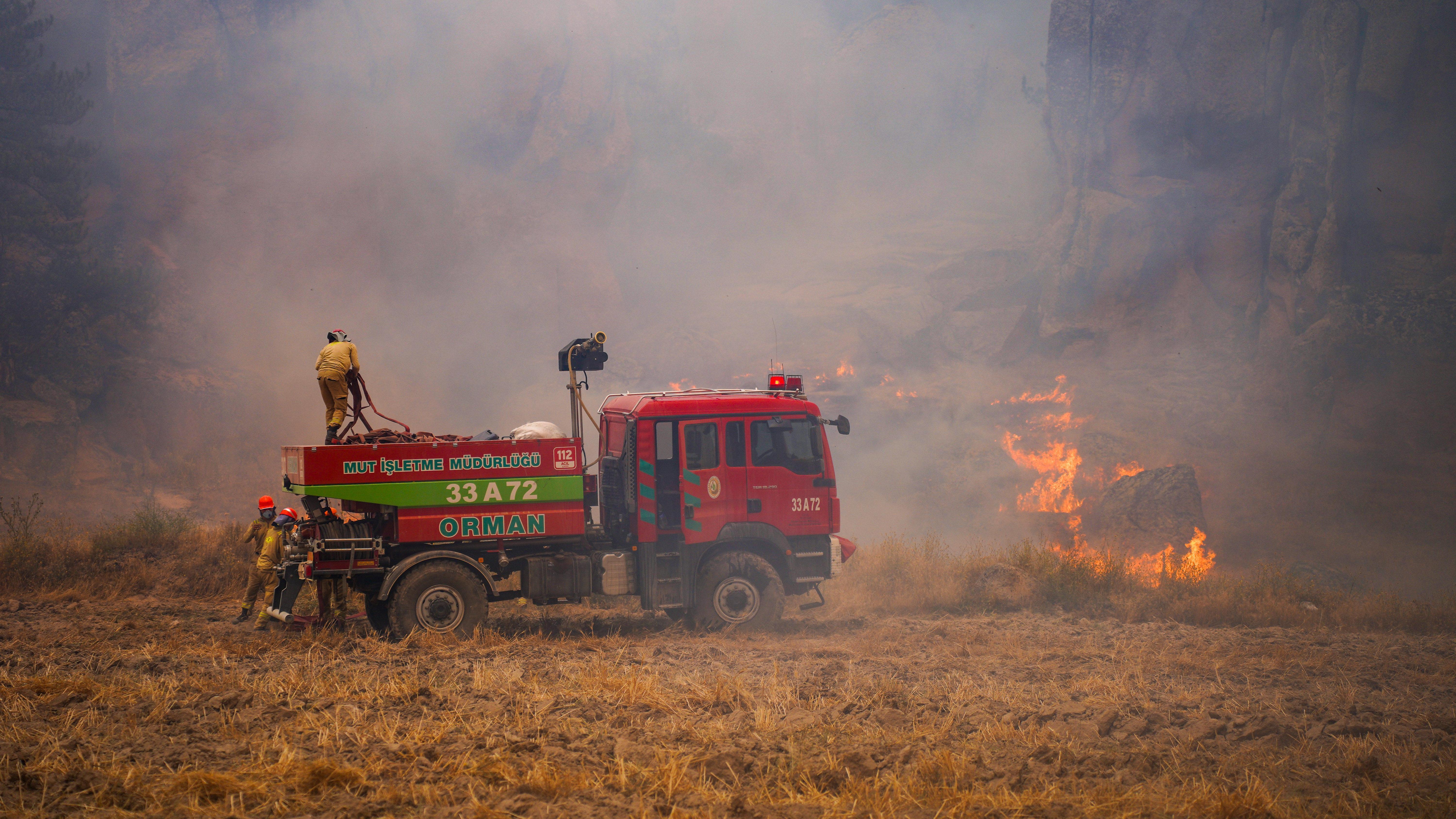 Patlayan kozalaklar nedeniyle zor anlar yaşanırken, ekipler, yangını izleyenleri bölgeden uzaklaşmaları konusunda uyarıyor. 3 gündür yangına müdahale eden orman işçileri, yemek ihtiyaçlarını arazözlerin üzerinde gideriyor. (DHA)