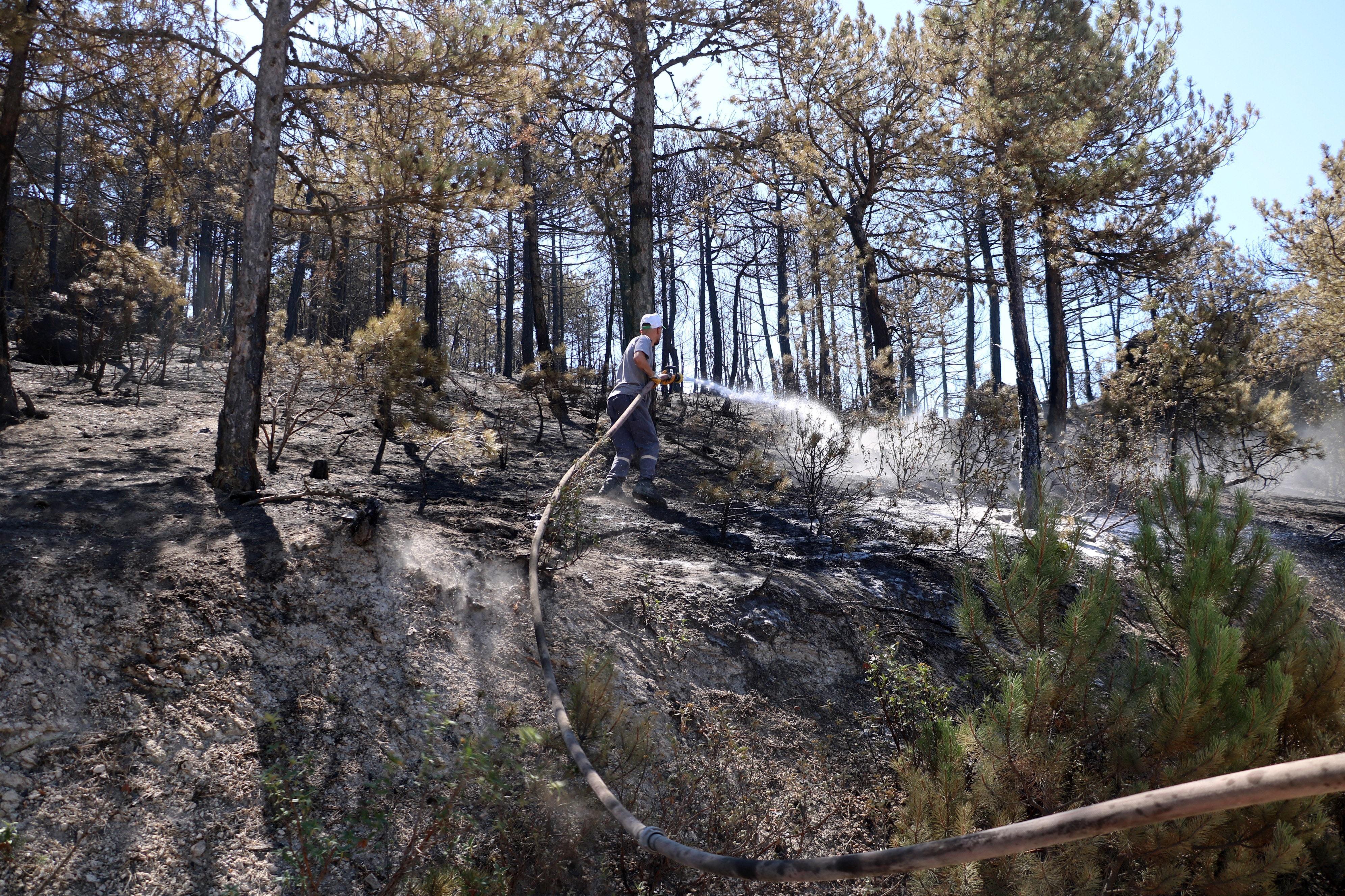 Soğutma çalışmalarını sürdüren Afyonkarahisar Orman İşletme Müdürlüğü İhsaniye Şefliğinde görevli Emre Kaan Gül, "Şu an yaptığımız çalışma, kimyasal köpük çalışmasıyla ateşin tamamen oksijenini kapatıyoruz, tüten yerleri soğutuyoruz, son duman kapanana kadar buradayız. Soğutma çalışmaları bugün başladı, kontrol altına alındıktan sonraki gün bugün artık için için yanma yok. Şu anda köklerde hafif tütmeler var, onları da Allah'ın izniyle kapatacağız. Birkaç gün daha buralardayız" dedi. (DHA)