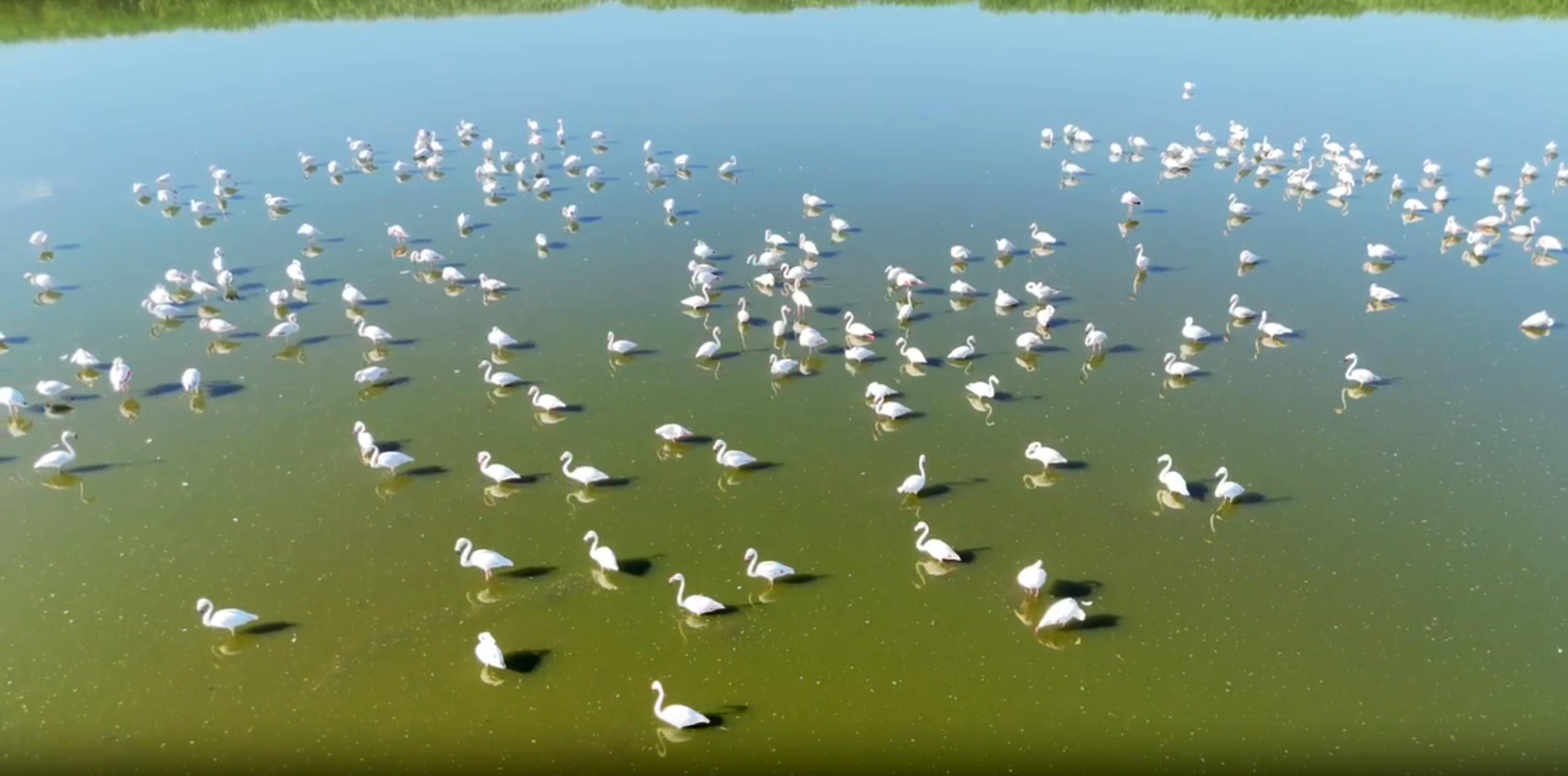 İlkbahar aylarında gelmeye başlayan flamingo sürüsü ve yavrular, su seviyesi azalan gölde dron ile görüntülendi. Anadolu'da 'Allı turna' olarak adlandırılan ve konu oldukları türkülerde hasret, özlem ve dert ortağı olarak sembolleştirilen flamingoların geçici konakladıkları gölden sonbahar mevsiminde göç etmesi bekleniyor. (DHA)