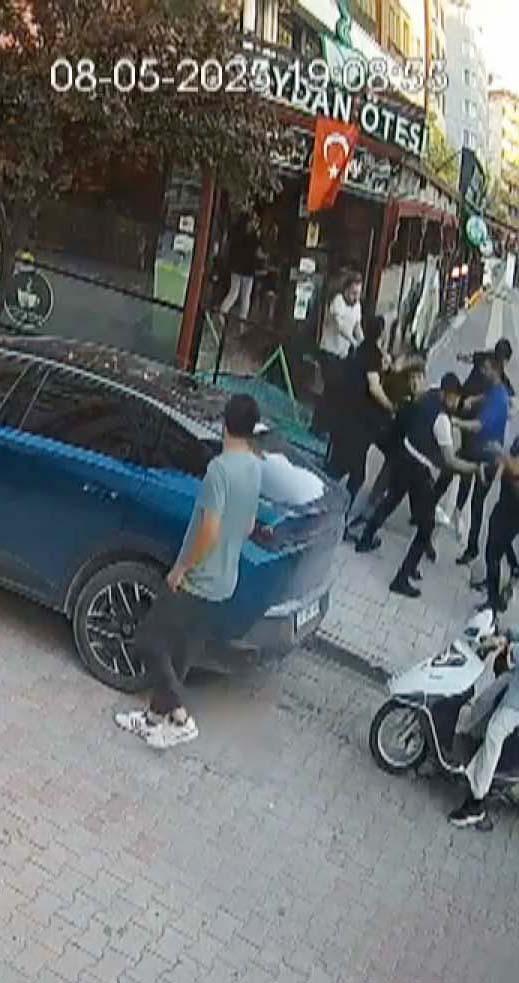 Kavga anı ise yan taraftaki iş yerinin güvenlik kamerasına yansıdı. Önce 2 kişinin koluna girdikleri 1 kişiyi güçlükle olay yerinden götürdüğü görülürken, ardından diğer grup arasında yaşanan tekme ve yumruklu kavga anları görüntüde yer aldı. (DHA)