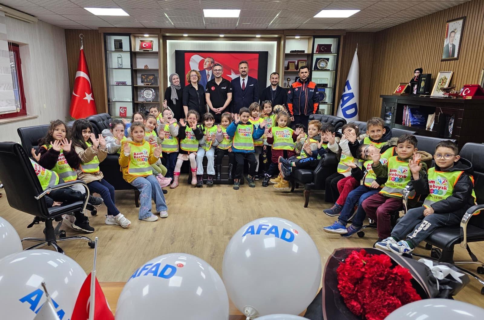 Asım Kocabıyık Anaokulu Müdürü Ramazan Yıldız, öğretmenlerden Pınar Yurdatapan ile öğrenciler, AFAD İl Müdürü Ali Altındal'ı ziyaret etti. İl Müdürü Altındal, öğrenci ve öğretmenlerine ziyaretlerinden dolayı teşekkür etti. Ziyaret hatıra fotoğrafıyla sona erdi. (DHA)