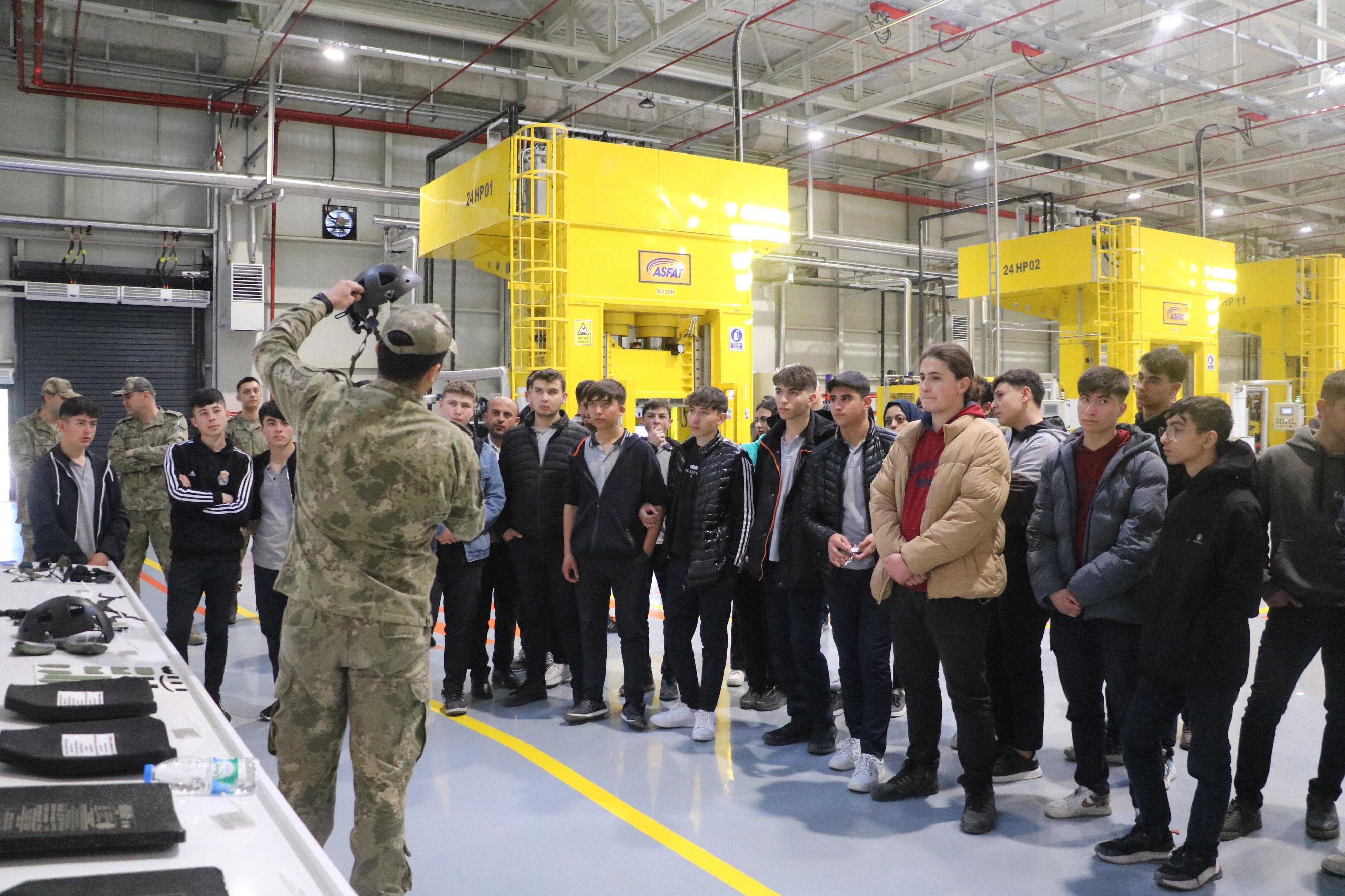 Fabrika Müdürü ve Mühendis Albay Tayfun Emirzeoğlu tarafından yapılan sunum sonrasında yemek yiyen öğrenciler, yeni üretilen askeri başlık, askeri yelekler, zırh ve bot üretim bölümlerini tek tek inceledi. Fabrikayı gezen öğrenciler, ürünleri yerinde görme fırsatı yakaladı. Fabrikada yer alan üretim kısmındaki 7 bin tonluk pres makinesinde, helikopter tabanlığı üretimi de gerçekleşiyor. Zırh üretim bölümünde bir zırha ateş edilerek, öğrencilere zırhın hazır olduğu gösterildi. Özel bölüm dışında bekleyen öğrenciler, ateş edilen zırhı daha sonra inceleme fırsatı buldu.