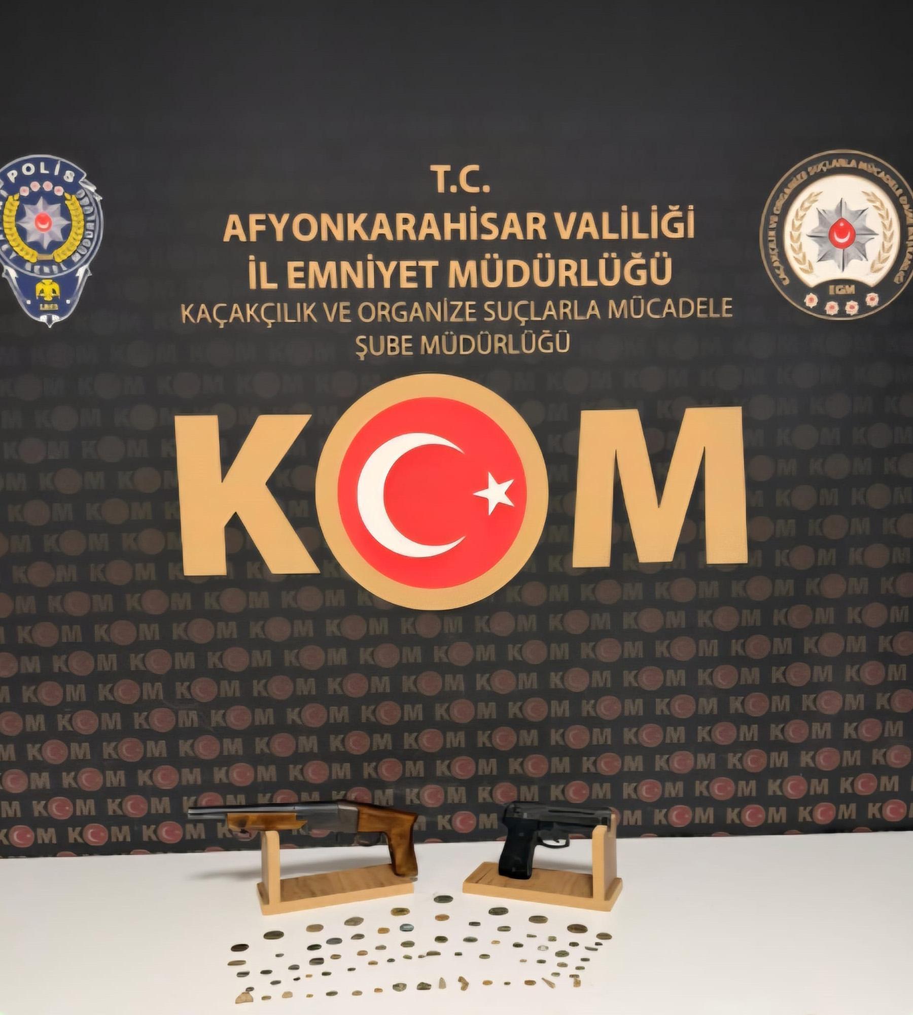 Afyonkarahisar İl Emniyet Müdürlüğü görevlilerince tarihi eser kaçakçılığı faaliyetlerinin önlenmesi ve tespitine yönelik çalışmalar kapsamında il merkezinde bir ikamette yapılan aramada 74 sikke, kısa namlu tüfek ve kuru sıkı tabanca ele geçirildi. Olayla ilgili 1 şüpheli hakkında 'Kültür ve tabiat varlıklarını koruma kanununa muhalefet' suçu kapsamında adli işlem başlatıldı. (DHA)