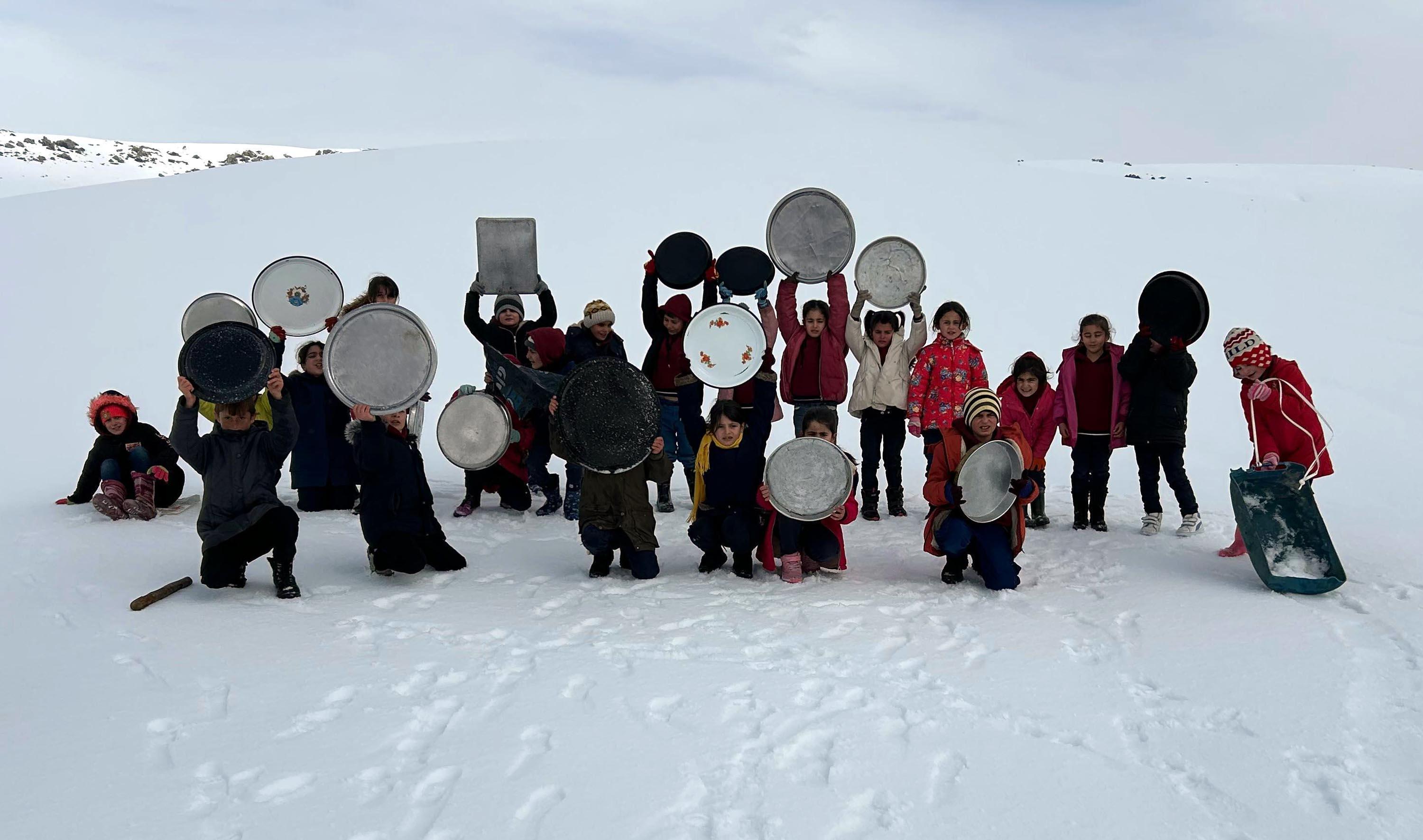 Semih YARDIMCI/PATNOS, (Ağrı), (DHA)- AĞRI'nın Patnos ilçesi Yukarı Kulecik köyünde öğrenciler, evlerinden getirdikleri tepsilerle köy merasında kayak yaptı.