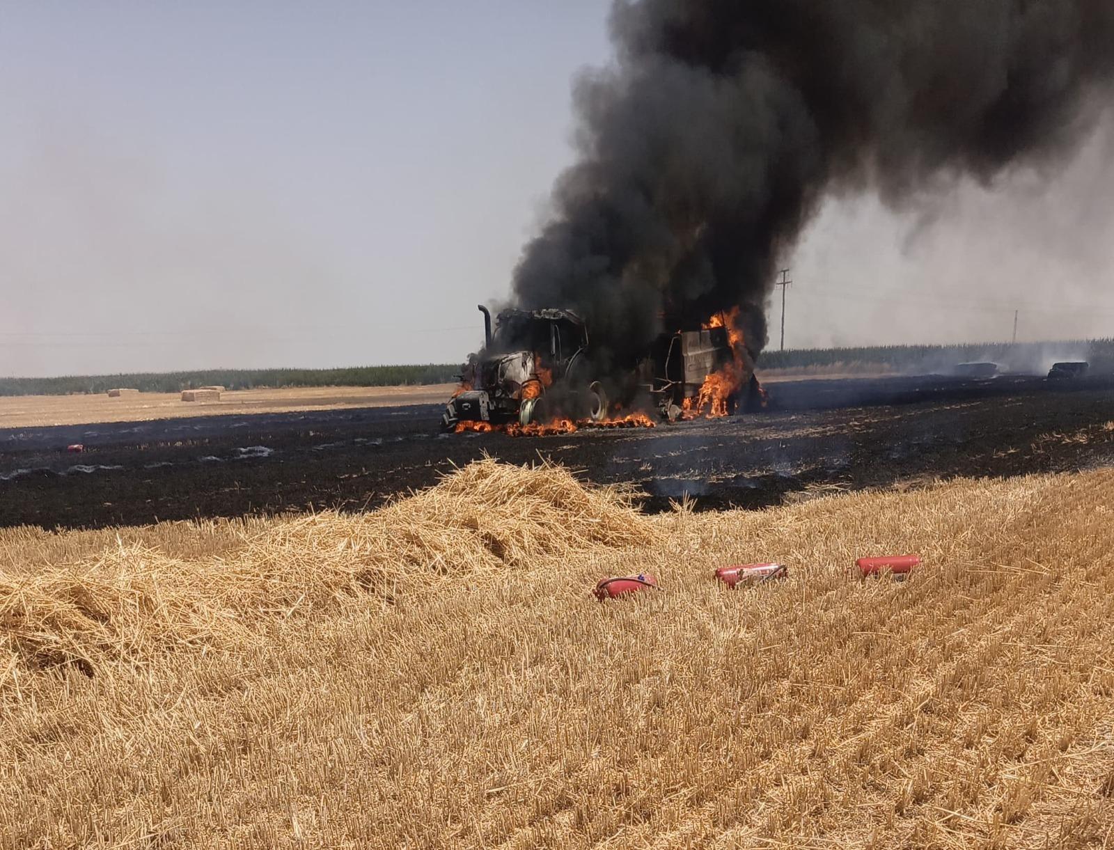 Hilmi YOL/ ESKİL (Aksaray),(DHA)- AKSARAY’ın Eskil ilçesinde buğday saplarından saman balyası yapıldığı sırada balya makinesi ve traktör yandı.
