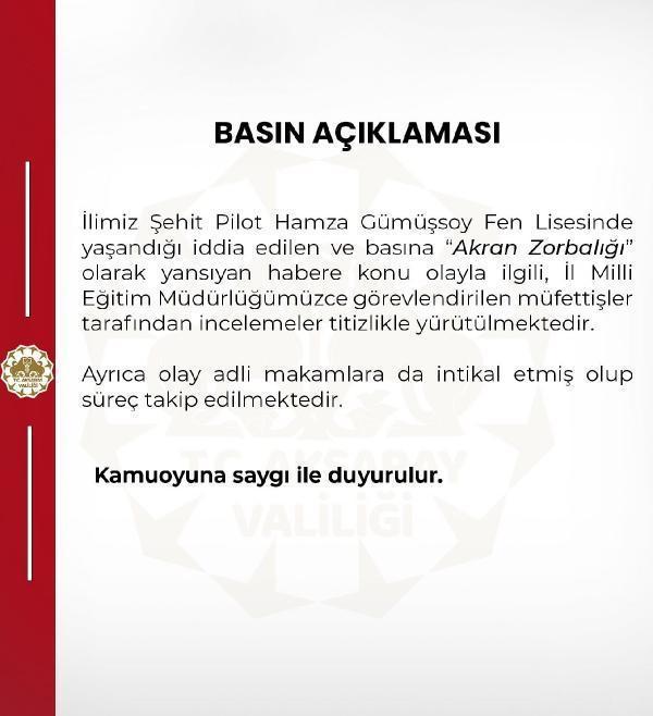 Aksaray Valiliği, fen lisesinde yaşanan 'akran zorbalığı' olayı ile ilgili açıklama yaptı. Açıklamada, "İlimiz Şehit Pilot Hamza Gümüşsoy Fen Lisesi'nde yaşandığı iddia edilen ve basına 'Akran Zorbalığı' olarak yansıyan habere konu olayla ilgili, İl Milli Eğitim Müdürlüğümüzce görevlendirilen müfettişler tarafından incelemeler titizlikle yürütülmektedir. Ayrıca olay adli makamlara da intikal etmiş olup süreç takip edilmektedir" denildi. (DHA)
