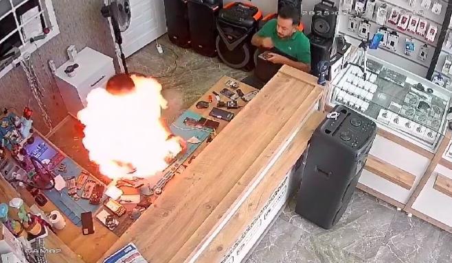 Tamire getirilen cep telefonu bataryası patlayıp, alev aldı; o anlar kamerada