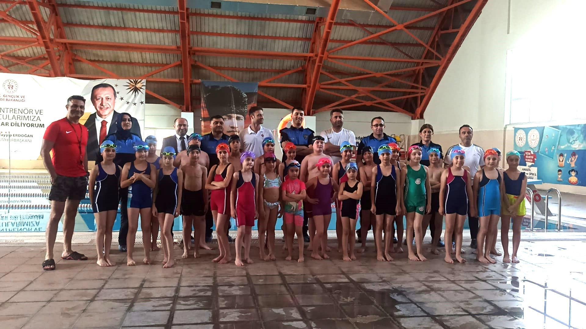 Bu kapsamda Emniyet Müdürlüğü, Gençlik ve Spor İl Müdürlüğü ortaklığı ile 24 çocuğun yüzme öğrenmesine katkıda bulunuldu. Merkezde bulunan Kapalı Yüzme Havuzunda Gençlik Spor İl Müdürlüğüne bağlı uzman antrenörler eşliğinde 7-11 yaş arasındaki 24 çocuk haftada 4 gün, günde 1 saat olmak üzere toplam 32 saat süreyle yüzme öğreniyor.