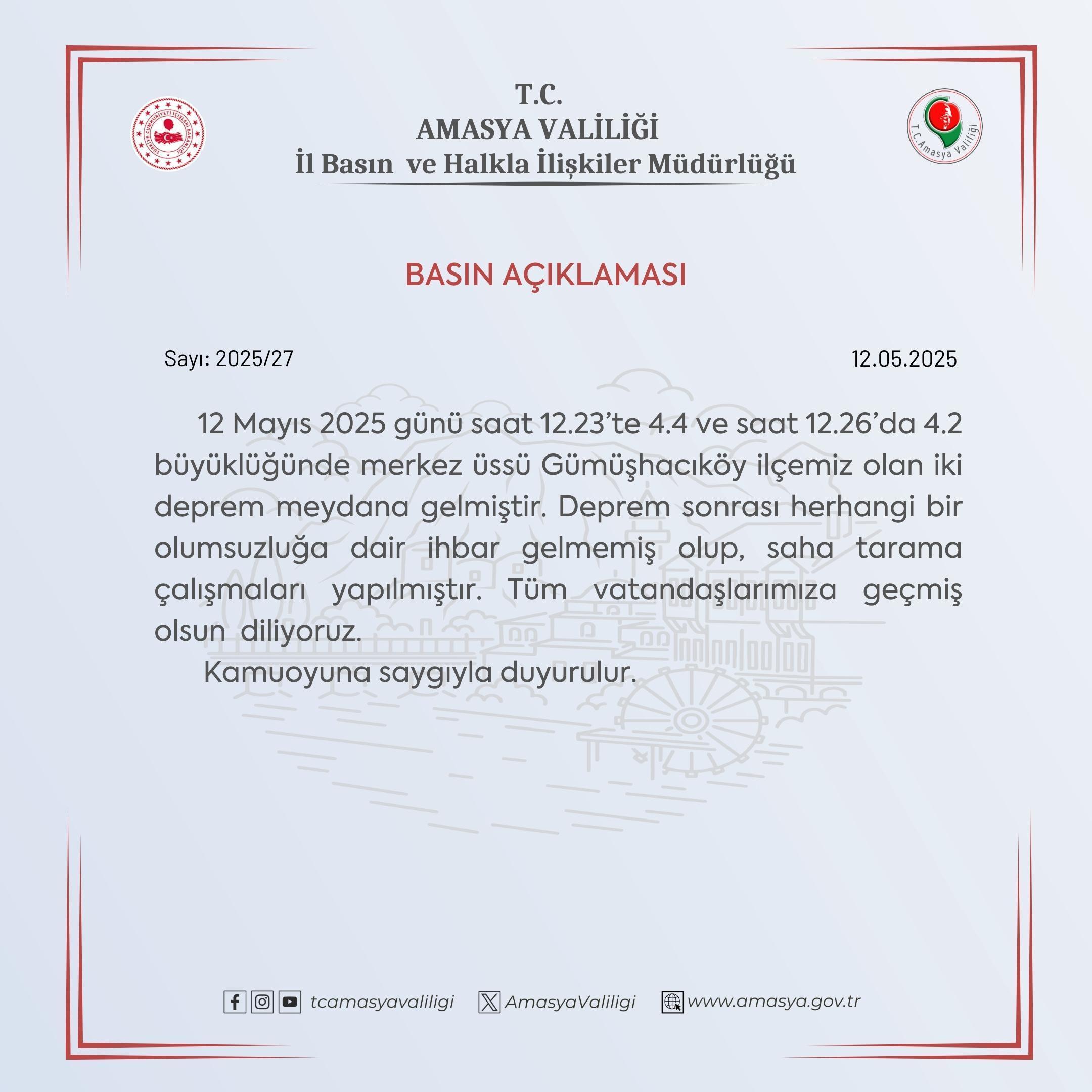 Amasya Valiliği, Gümüşhacıköy ilçesinde 3 dakika arayla 4.4 ve 4.2 büyüklüğünde meydana gelen iki depreme ilişkin açıklama yaptı. Açıklamada, “12 Mayıs 2025 günü saat 12.23’te 4.4 ve saat 12.26’da 4.2 büyüklüğünde merkez üssü Gümüşhacıköy ilçemiz olan iki deprem meydana gelmiştir. Deprem sonrası herhangi bir olumsuzluğa dair ihbar gelmemiş olup saha tarama çalışmaları yapılmıştır. Tüm vatandaşlarımıza geçmiş olsun diliyoruz” denildi.