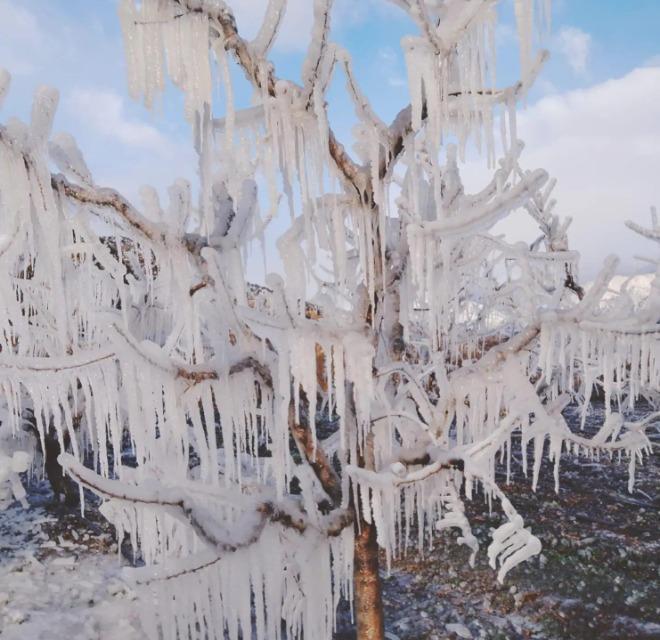 Kentte 1 haftadır etkili olan soğuk hava, meyve yetiştiricilerinin faaliyetlerini de olumsuz etkiledi. Hava sıcaklığının eksi 9 dereceye kadar düşmesi sonucu, çiftçi, ağaçların zarar görmesini önlemek amacıyla fıskiyeyle su sıktı. Yaşanan don sonucu ağaçların dallarında sarkıtlar oluştu.