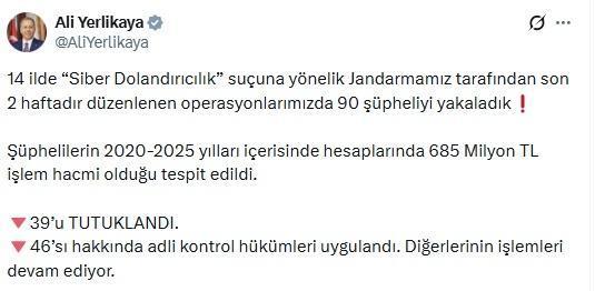 Bakan Yerlikaya, jandarma tarafından düzenlenen operasyonu sanal medya hesabından duyurdu. Buna göre; jandarma tarafından son 2 haftada 14 ilde 'Siber dolandırıcılık' suçuna yönelik düzenlenen operasyonlarda 90 şüpheli yakalandı. Şüphelilerin 2020-2025 yılları içerisinde hesaplarında 685 milyon TL işlem hacmi olduğu tespit edildi. Şüphelilerin; vatandaşlara ait kişisel bilgileri yasa dışı yollarla ele geçirerek kullandıkları, sosyal medya hesapları üzerinden 'yatırım danışmanlığı, sınavsız ehliyet, akülü araba, mobilya, araç yedek parçası, elektronik eşya satışı ve bungalov kiralama' gibi sahte ilanlarla vatandaşları dolandırdıkları, yasa dışı bahis oynattıkları ve suçtan elde edilen paranın nakline aracılık ettikleri, vatandaşların banka hesaplarından bilgileri dışında para çekerek haksız kazanç sağladıkları tespit edildi. Şüpheliler hakkında savcılıklar tarafından soruşturma başlatıldı. Yakalanan şüphelilerin 39’u tutuklandı, 46’sı hakkında adli kontrol hükümleri uygulandı. Diğerlerinin işlemleri ise devam ediyor. (DHA)