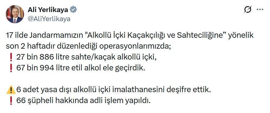 Umutcan ÖREN/ANKARA, (DHA)- İÇİŞLERİ Bakanı Ali Yerlikaya, 17 ilde düzenlenen kaçak ve sahte içki operasyonlarında 66 şüpheli hakkında adli işlem yapıldığını açıkladı.