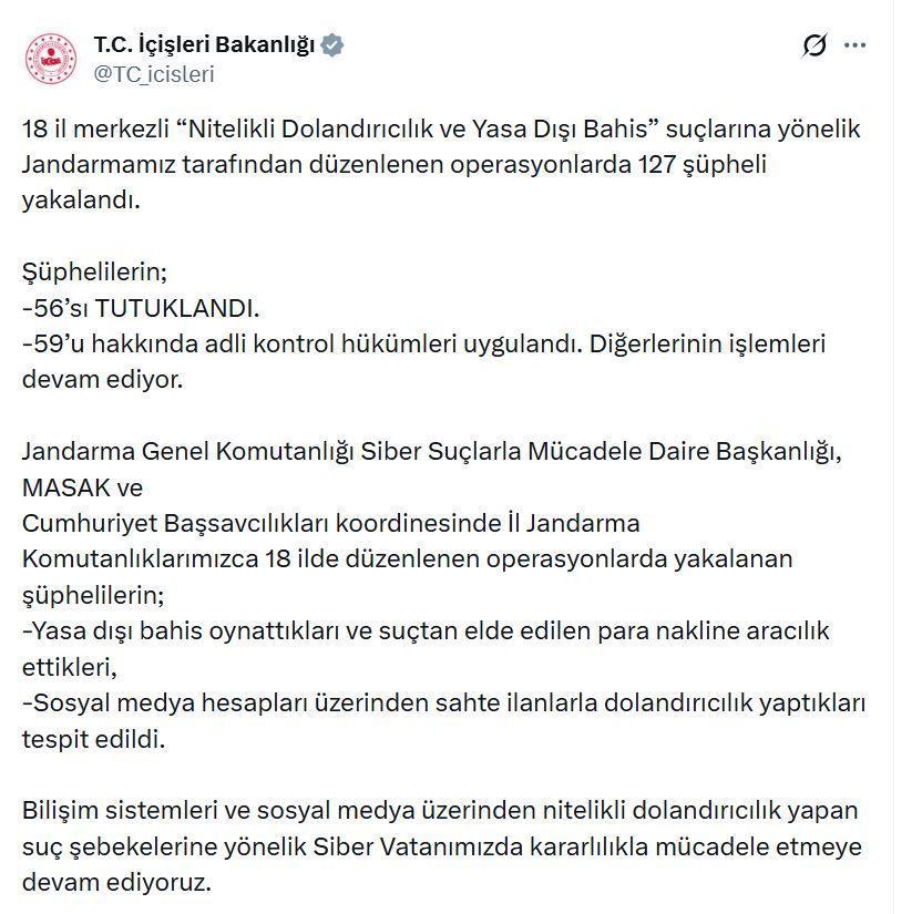 Bakanlığın sanal medya hesabından yapılan yazılı açıklamada, "18 il merkezli 'nitelikli dolandırıcılık ve yasa dışı bahis' suçlarına yönelik jandarmamız tarafından düzenlenen operasyonlarda 127 şüpheli yakalandı. Şüphelilerin 56'sı tutuklandı, 59'u hakkında adli kontrol hükümleri uygulandı. Diğerlerinin işlemleri devam ediyor" denildi.