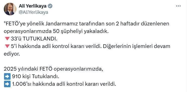 İçişleri Bakanı Yerlikaya'nın, sosyal medya hesabından yaptığı açıklamaya göre; son 2 haftada Aksaray, Amasya, Ankara, Aydın, Balıkesir, Batman, Bursa, Edirne, Elazığ, Gaziantep, Hatay, İzmir, Karaman, Kırıkkale, Kocaeli, Kütahya, Manisa, Mersin, Şanlıurfa ve Yozgat'ta FETÖ'ye yönelik operasyonlar düzenlendi. Jandarma tarafından gerçekleştirilen operasyonlarda 50 şüpheli yakalandı. 'FETÖ terör örgütünün güncel yapılanması içinde faaliyet yürütmek', 'ankesörlü telefonlarla örgüt içerisinde sorumlu şahıslarla irtibatta bulunmak', 'terör örgütüyle iltisaklı sözde yardım kuruluşlarına finans sağlamak' ve 'sosyal medya hesapları üzerinden FETÖ terör örgütünün propagandasını yapmak' suçlarından gözaltına alınan şüphelilerden 33'ü tutuklandı, 5’i hakkında adli kontrol kararı verildi. Diğer şüphelilerin ise işlemleri devam ediyor.