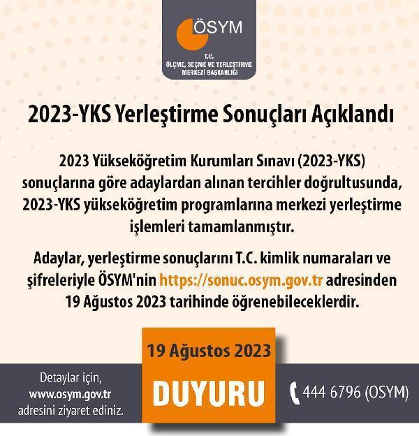 ANKARA, (DHA)- ÖLÇME, Seçme ve Yerleştirme Merkezi Başkanlığı (ÖSYM), 2023-YKS yerleştirme sonuçlarının açıklandığını duyurdu.