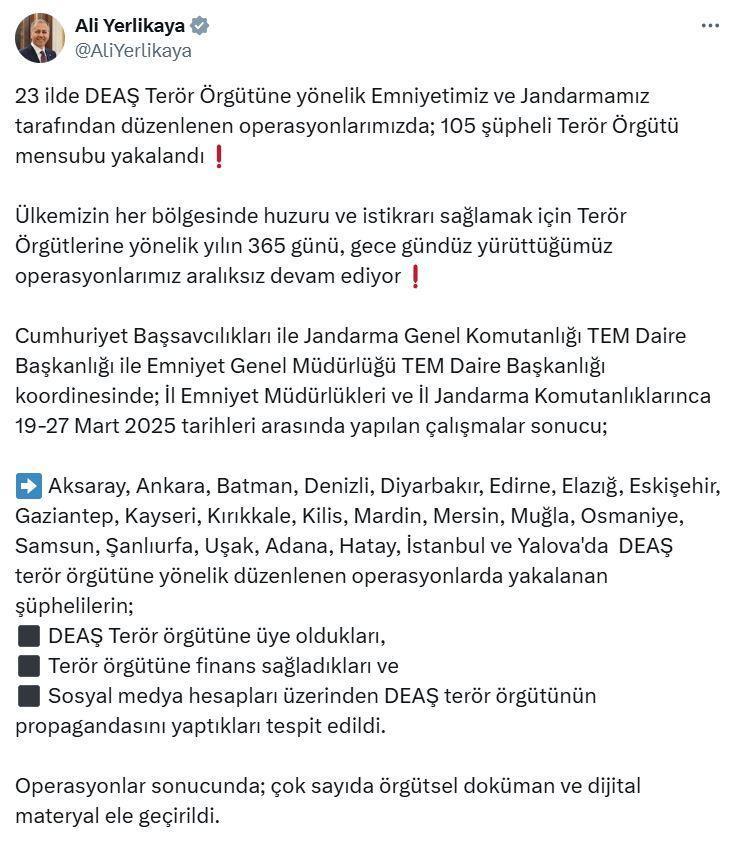 Bakan Yerlikaya'nın, sosyal medya hesabından yaptığı açıklamaya göre; Cumhuriyet başsavcılıkları ile Jandarma Genel Komutanlığı ve Emniyet Genel Müdürlüğü birimleri koordinesinde, 19-27 Mart 2025 tarihleri arasında 23 ilde DEAŞ terör örgütüne yönelik operasyonlar düzenlendi. Operasyonlarda 105 şüpheli yakalandı, çok sayıda örgütsel doküman ve dijital materyal ele geçirildi. Şüphelilerin; DEAŞ terör örgütüne üye oldukları, terör örgütüne finans sağladıkları ve sosyal medya hesapları üzerinden DEAŞ terör örgütünün propagandasını yaptıkları tespit edildi.