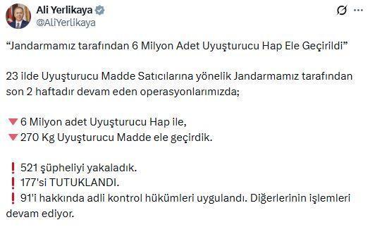 İçişleri Bakanı Yerlikaya, jandarma tarafından son 2 haftada düzenlenen operasyonları, sanal medya hesabından duyurdu. Buna göre; 46 narkotik ve asayiş ekibi, 414 personelin katılımıyla; 23 ilde gerçekleşen operasyonlarda 6 milyon adet uyuşturucu hap ile 270 kilo uyuşturucu ele geçirildi. Operasyonlarda 521 şüpheli yakalandı. Şüphelilerden 177'si tutuklandı. 91'i hakkında adli kontrol hükümleri uygulandı. Diğerlerinin işlemleri devam ediyor.