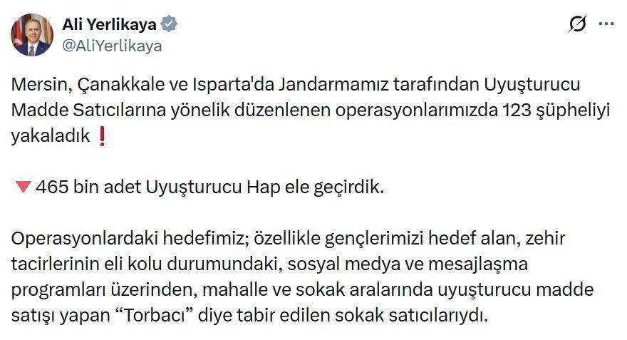Umutcan ÖREN/ANKARA, (DHA)- İÇİŞLERİ Bakanı Yerlikaya, Mersin, Çanakkale ve Isparta'da düzenlenen narkotik operasyonlarında 123 şüphelinin yakalandığını, 465 bin uyuşturucu hap ele geçirildiğini açıkladı.