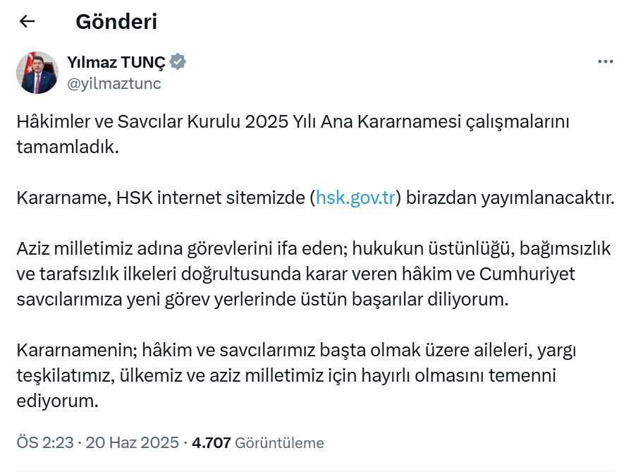 Kararname ile ilgili sosyal medya hesabından paylaşım yapan Adalet Bakanı Yılmaz Tunç, "Hakimler ve Savcılar Kurulu 2025 Yılı Ana Kararnamesi çalışmalarını tamamladık. Aziz milletimiz adına görevlerini ifa eden; hukukun üstünlüğü, bağımsızlık ve tarafsızlık ilkeleri doğrultusunda karar veren hakim ve Cumhuriyet savcılarımıza yeni görev yerlerinde üstün başarılar diliyorum. Kararnamenin; hakim ve savcılarımız başta olmak üzere aileleri, yargı teşkilatımız, ülkemiz ve aziz milletimiz için hayırlı olmasını temenni ediyorum" dedi. (DHA)