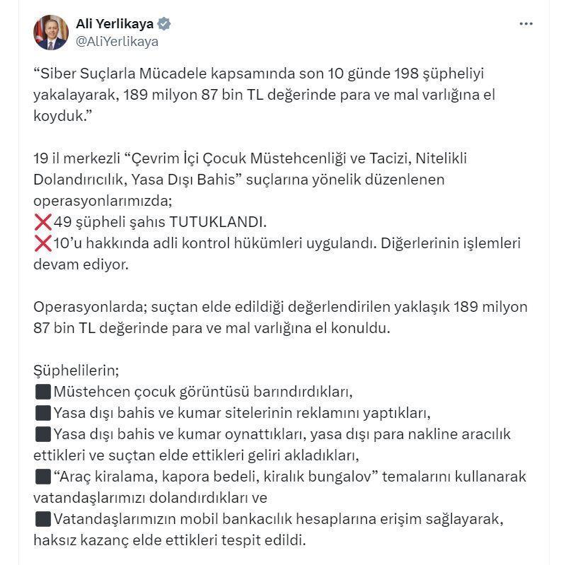Bakan Yerlikaya, sosyal medya hesabından yaptığı açıklamada, siber suçlarla mücadele kapsamında son 10 günde 198 şüpheliyi yakaladıklarını belirterek, "19 il merkezli 'çevrim içi çocuk müstehcenliği ve tacizi, nitelikli dolandırıcılık, yasa dışı bahis' suçlarına yönelik düzenlenen operasyonlarımızda; 49 şüpheli şahıs tutuklandı. 10'u hakkında adli kontrol hükümleri uygulandı. Diğerlerinin işlemleri devam ediyor. Operasyonlarda; suçtan elde edildiği değerlendirilen yaklaşık 189 milyon 87 bin TL değerinde para ve mal varlığına el konuldu. Şüphelilerin; müstehcen çocuk görüntüsü barındırdıkları, yasa dışı bahis ve kumar sitelerinin reklamını yaptıkları, yasa dışı bahis ve kumar oynattıkları, yasa dışı para nakline aracılık ettikleri ve suçtan elde ettikleri geliri akladıkları, 'araç kiralama, kapora bedeli, kiralık bungalov' temalarını kullanarak vatandaşlarımızı dolandırdıkları ve vatandaşlarımızın mobil bankacılık hesaplarına erişim sağlayarak, haksız kazanç elde ettikleri tespit edildi" dedi.