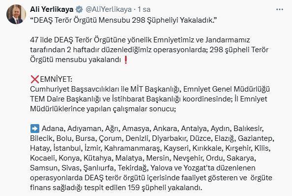 ANKARA, (DHA)- İÇİŞLERİ Bakanı Ali Yerlikaya, 47 ilde DEAŞ terör örgütüne yönelik operasyonlarda 298 şüphelinin yakalandığını açıkladı.