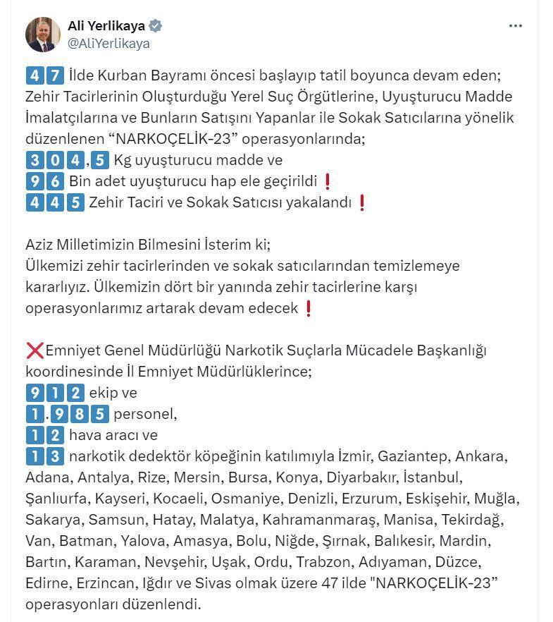 Bakan Yerlikaya, sosyal medya hesabından yaptığı açıklamada, "Emniyet Genel Müdürlüğü Narkotik Suçlarla Mücadele Başkanlığı koordinesinde il emniyet müdürlüklerince; 912 ekip ve 1985 personel, 12 hava aracı ve 13 narkotik dedektör köpeğinin katılımıyla İzmir, Gaziantep, Ankara, Adana, Antalya, Rize, Mersin, Bursa, Konya, Diyarbakır, İstanbul, Şanlıurfa, Kayseri, Kocaeli, Osmaniye, Denizli, Erzurum, Eskişehir, Muğla, Sakarya, Samsun, Hatay, Malatya, Kahramanmaraş, Manisa, Tekirdağ, Van, Batman, Yalova, Amasya, Bolu, Niğde, Şırnak, Balıkesir, Mardin, Bartın, Karaman, Nevşehir, Uşak, Ordu, Trabzon, Adıyaman, Düzce, Edirne, Erzincan, Iğdır ve Sivas olmak üzere 47 ilde 'Narkoçelik-23' operasyonları düzenlendi. Operasyonlarda; 304,5 kilo uyuşturucu madde ve 96 bin adet uyuşturucu hap ele geçirildi. 445 zehir taciri ve sokak satıcısı yakalandı" dedi.