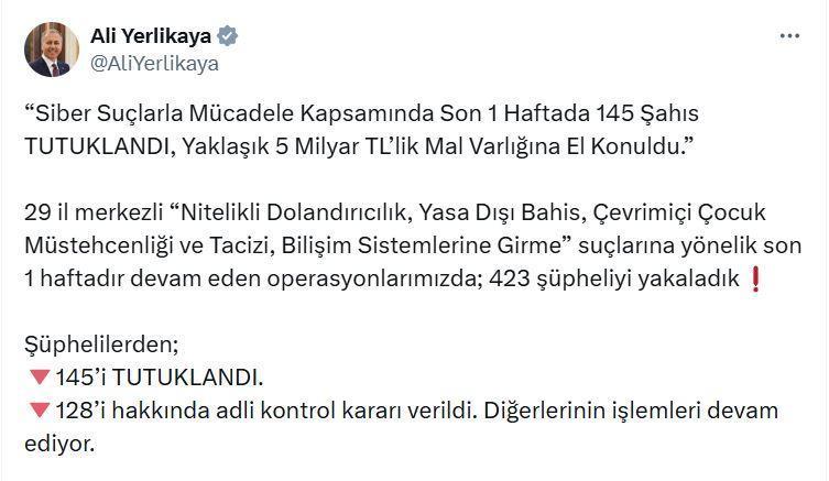 Bakan Ali Yerlikaya, sosyal medya hesabından yaptığı açıklamada, "29 il merkezli 'Nitelikli dolandırıcılık, yasa dışı bahis, çevrim içi çocuk müstehcenliği ve tacizi, bilişim sistemlerine girme' suçlarına yönelik son 1 haftadır devam eden operasyonlarımızda; 423 şüpheliyi yakaladık. Şüphelilerden 145'i tutuklandı. 128'i hakkında adli kontrol kararı verildi. Diğerlerinin işlemleri devam ediyor" ifadelerini kullandı.