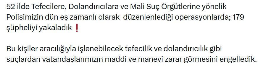 İçişleri Bakanı Yerlikaya, polis tarafından düzenlenen operasyonu sosyal medya hesabından duyurdu. Buna göre; 'Tefecilik', 'Nitelikli dolandırıcılık', 'Kamu kurum ve kuruluşlarının zararına yönelik nitelikli dolandırıcılık', 'İhaleye fesat karıştırma', 'Rüşvet', 'Zimmet ve irtikap', 'Vergi usul kanununa muhalefet', 'Görevi kötüye kullanma', 'Resmi belgede sahtecilik', 'Parada sahtecilik', 'ÖSYM Kanunu'na muhalefet' suçlarına yönelik düzenlenen operasyonda 179 şüpheli yakalandı. Şüpheliler haklarında, adli işlem başlatıldı. (DHA)