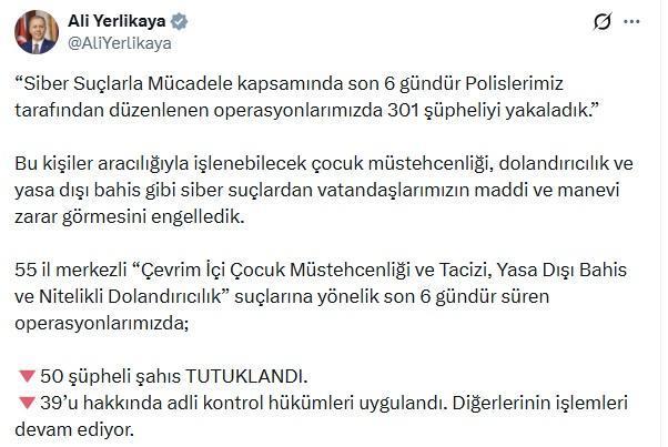 İçişleri Bakanı Ali Yerlikaya, polis tarafından düzenlenen operasyonları sosyal medya hesabından duyurdu. Buna göre; 55 il merkezli 'Çevrim içi çocuk müstehcenliği ve tacizi, Yasa dışı bahis ve Nitelikli dolandırıcılık' suçlarına yönelik son 6 gündür süren operasyonlarda 301 şüpheli yakalandı. Şüphelilerden 50'si tutuklanırken, 39’u hakkında adli kontrol hükümleri uygulandı, diğerlerinin işlemleri devam ediyor. Şüphelilerin; müstehcen çocuk görüntüsü barındırdıkları, sosyal medya platformları ve oltalama (phishing) siteleri üzerinden 'yatırım danışmanlığı, ürün satışı, sosyal yardım, düşük faizli kredi' temalarını kullanarak vatandaşları dolandırdıkları, kişisel verilerin paylaşımı ve sorgulama konularında paylaşımlar yaptıkları, yasa dışı bahis ve kumar oynattıkları, yasa dışı bahis sitelerinde para nakline aracılık ettikleri, reklamını yaptıkları tespit edildi. (DHA)
